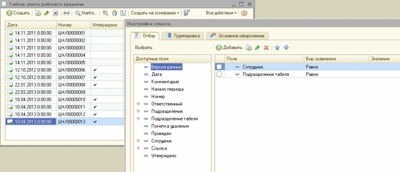 После этого заходим на закладку "Компоновка данных", "Условия" и добавляем нужные в отборе поля: