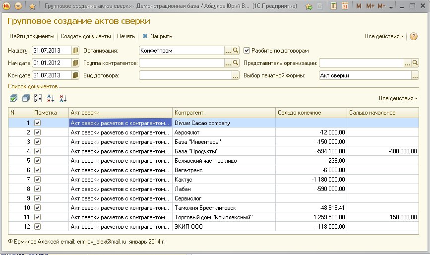 - при установленном - по каждому контрагенту формируется общий акт смверки с указанием довора в табличной части;