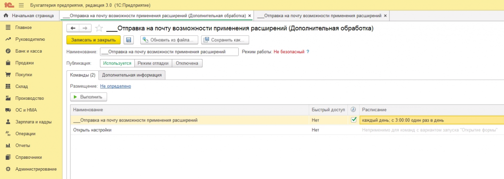 На одном из проектов много баз с типовыми конфигурациями. Доработки ведутся в расширениях. Обновления типовых выполняются без учета доработок в расширениях. Периодически это приводит к тому, что в расширении возникает проблема применения, и расширение работать перестает. Как правило, об этом узнают пользователи в тот момент, когда им нужен функционал расширения. Дальше они просят починить в режиме "еще вчера", и возникают сложности. Чтобы избежать этой ситуации и узнавать о возникшей проблеме заблаговременно, решили написать обработку, которая будет запускаться по расписанию, проверять расширения и, если будет обнаруживать проблемы применения, будет отправлять их описание на указанные адреса электронной почты.