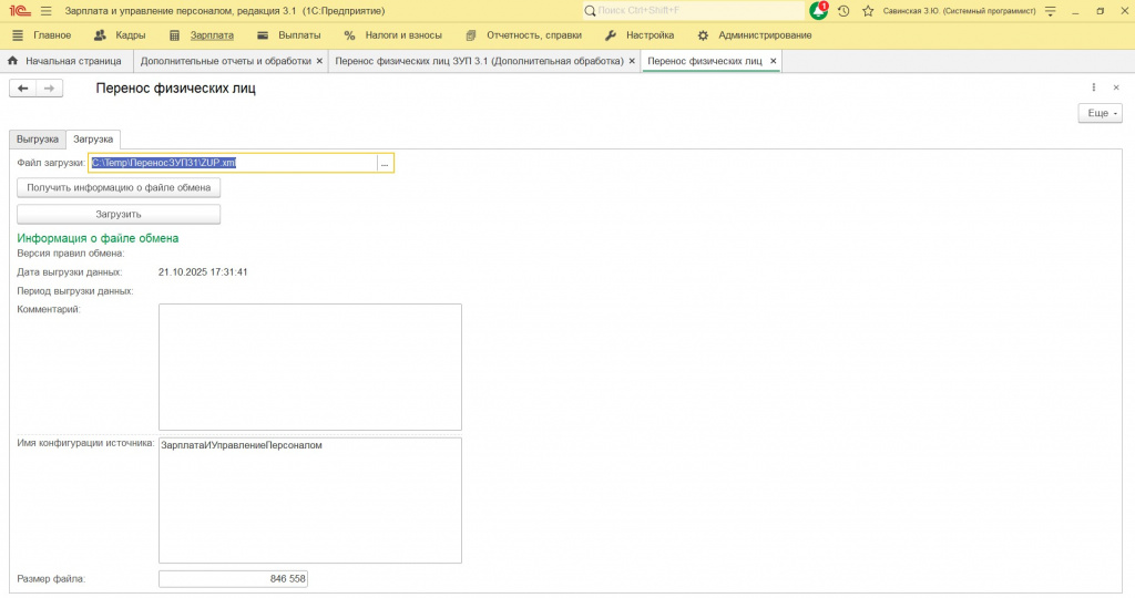 Внешняя обработка позволяет перенести из одной базы ЗУП 3.1 в другую выбранные элементы справочника физических лиц, а также сопутствующие учетные данные.