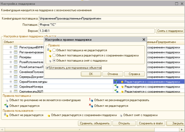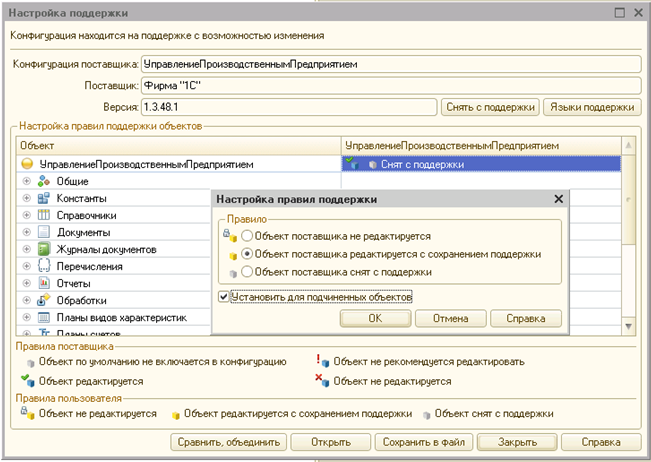 Казалось-бы не очень логично - но в итоге объект конфигурации "УправлениеПроизводственнымПредприятием"- т.е. вся конфигурация, будет снят с поддержки. Для постановки на поддержку делаем следующее: Конфигурация – Поддержка – Настройка поддержки. Изменяем правила поддержки для объекта "УправлениеПроизводственнымПредприятием". Если необходима в дальнейшем возможность редактирования объектов конфирурации, то устанавливаем параметры как показано на рис.7. Обязательно ставим "галочку" "Устанавливать для подчиненных объектов". Закрываем окно настройки.
