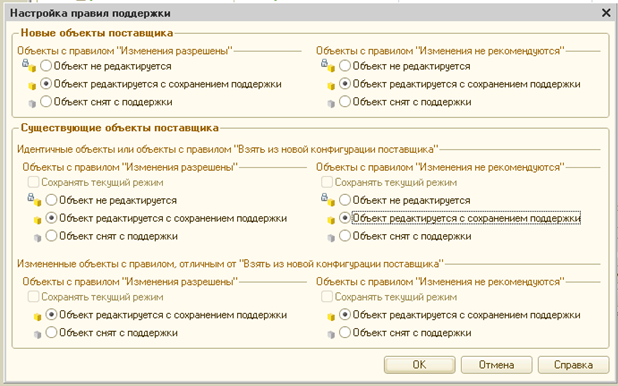 Конфигуратор предложит настроить правила поддержки. Если необходима в дальнейшем возможность редактирования объектов конфирурации, то настраиваем правила поддержки так, как показано на рис.6.
