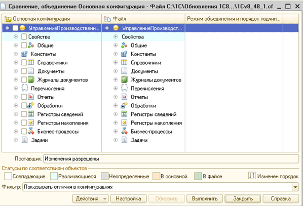 Итак, обновляя конфигурации через сравнение и объединение я получил основную конфигурацию  1.3.48, при этом конфигурация поставщика 1.3.17 рис.1. и рис.2.