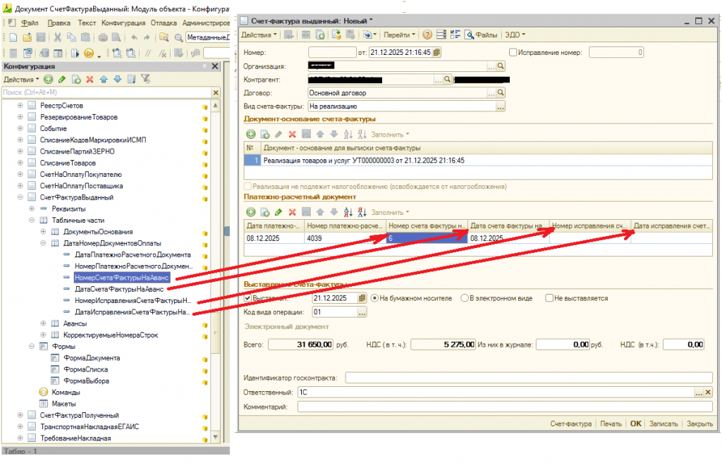 На более ранних реализах работать не будет (выпущенных до 17.12.2025 ) т.к. в документе Счет-фактуре в табличной части "платежно-расчетном документе" добавлены новые колонки (Номер счета-фактуры на аванс, Дата счета-фактуры на аванс, Номер исправления счета-фактуры на аванс, Дата исправления счета-фактуры на аванс)
