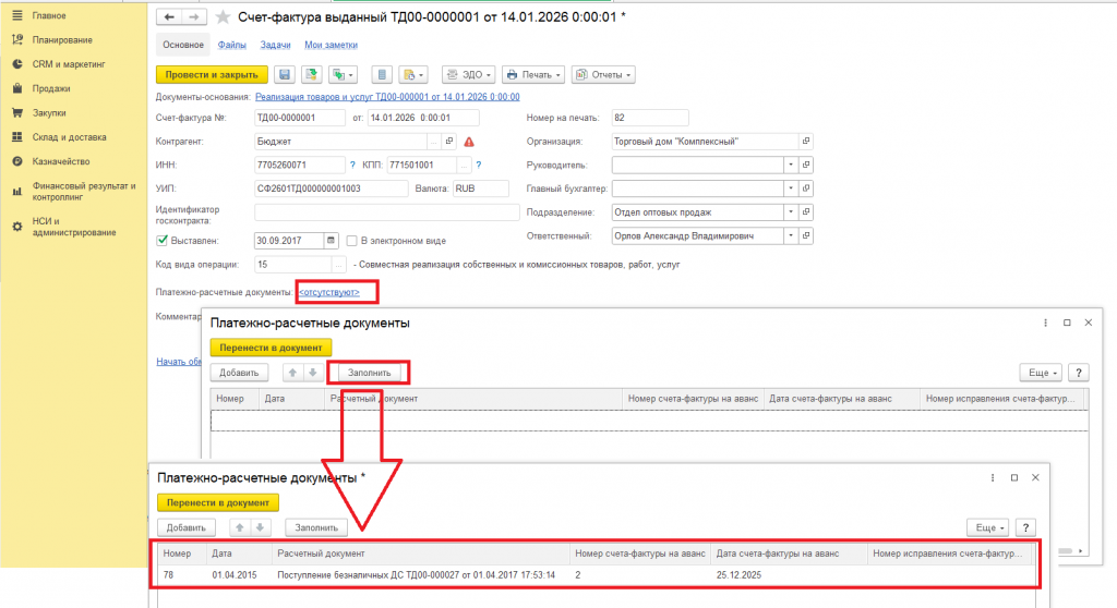 В расширение в документе Счет-фактуре в табличной части "платежно-расчетном документе" добавлены новые колонки: