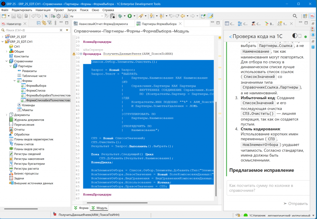 Во вторых — это ревью своего ранее написанного кода. Мне захотелось его привести к стандартам кода 1С. Я загрузил (импортировал) рабочую конфигурацию ERP и расширения, в которых вносились все изменения.