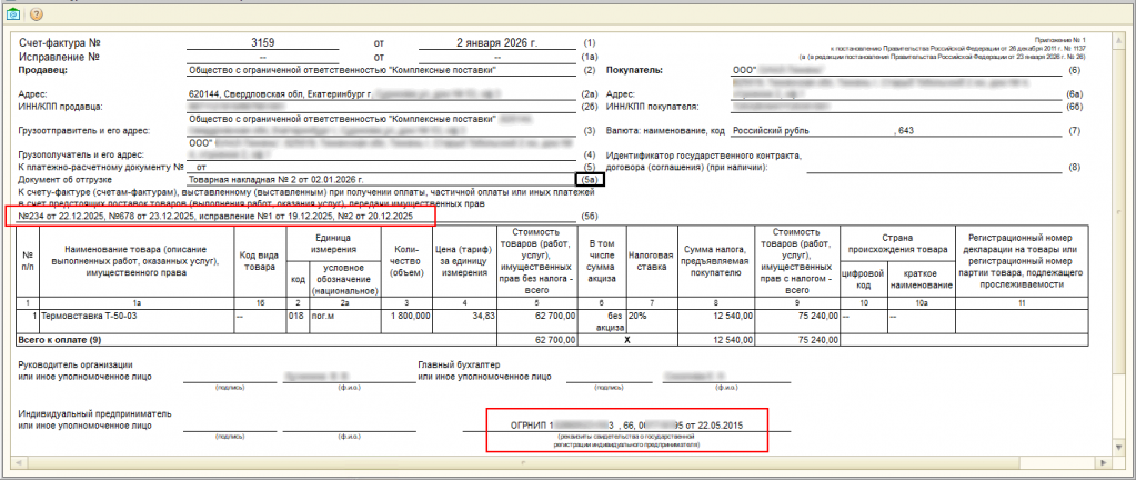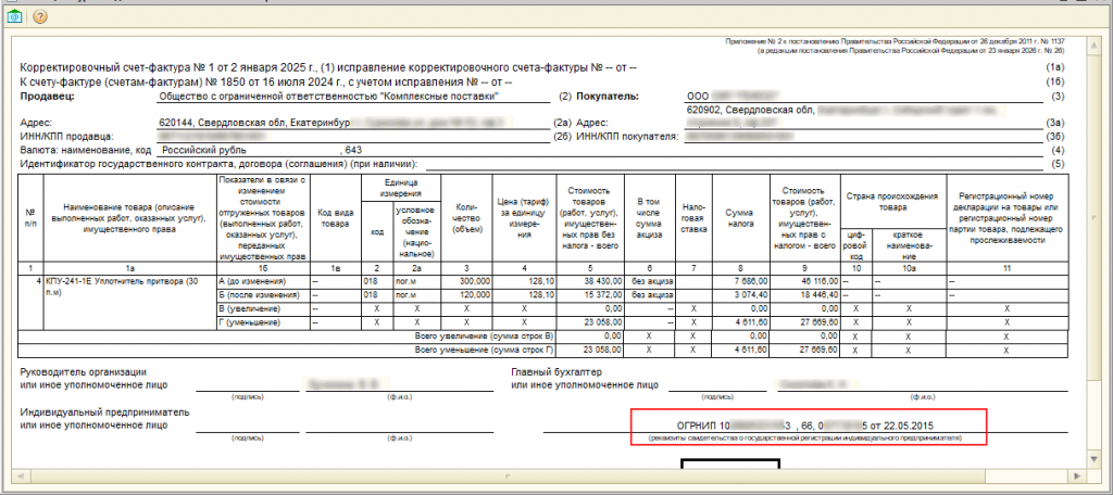 - Вывод ОГРНИП (в корректировочной выводится только этот параметр, так как вывод данных авансов в корректировочной счет-фактуре не требуется с 2026 года).