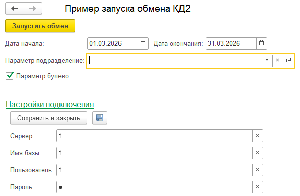 2. В обработке настраивается подключение к внешней базе и параметры запуска. Обработку можно настроить на регламентный запуск по расписанию типовыми средствами доп. обработок.