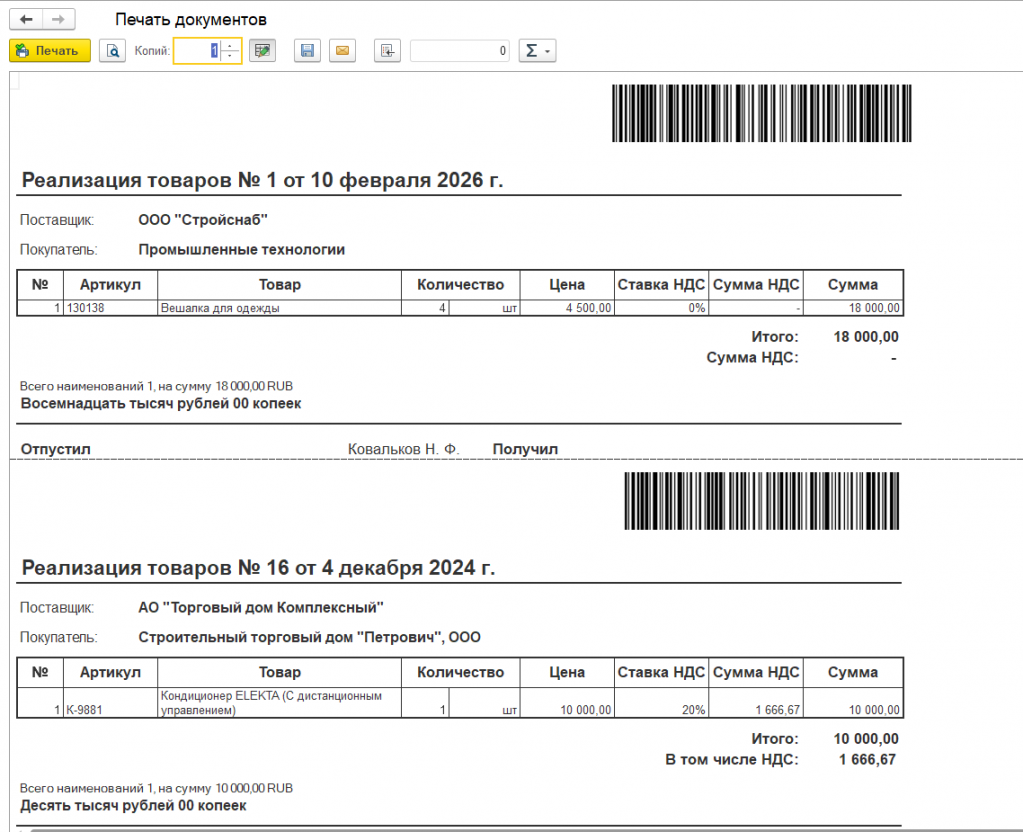 При формирование печатной формы в списке по выделенным документам открывается форма предварительного просмотра. Формируется одна печатная форма по выделенным документам.