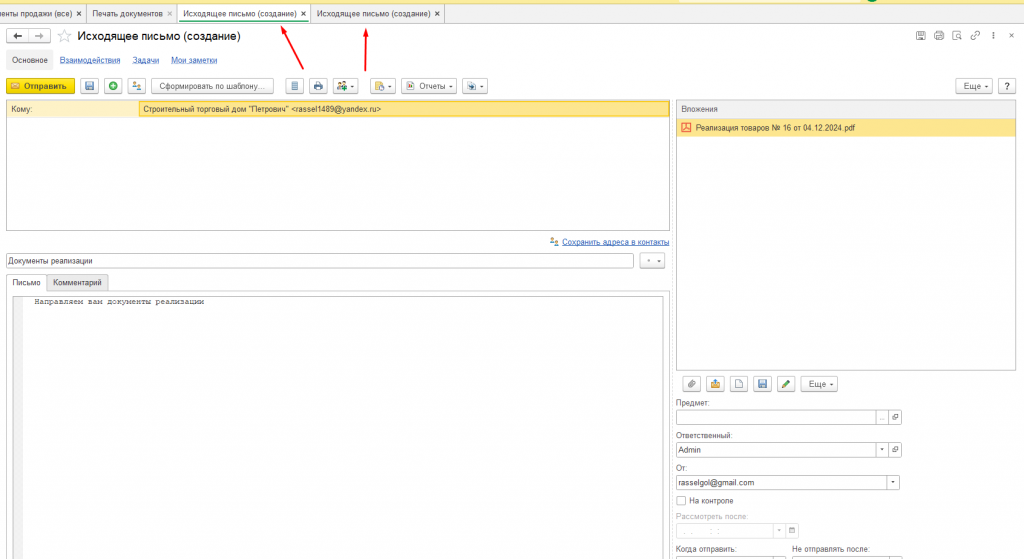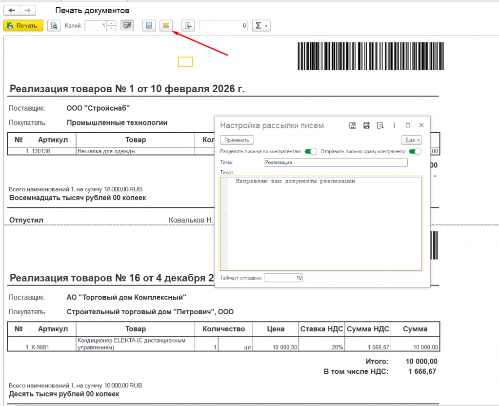При активной настройки "Разделять письма по контрагентам" сформируются электронные письма, для каждого контрагента своё, с вложенными их ними печатными формами.