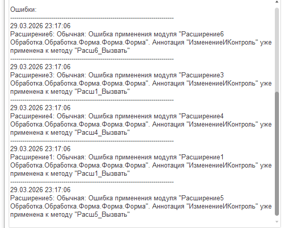 Это значит, что с изменением и контролем берется самое первое расширение в списке, если открыть обработку, появится уведомление о том, что аннотация уже применена к методу «Расш_Вывод». При этом оповещения идут в обратном порядке расширений, т.е снизу вверх