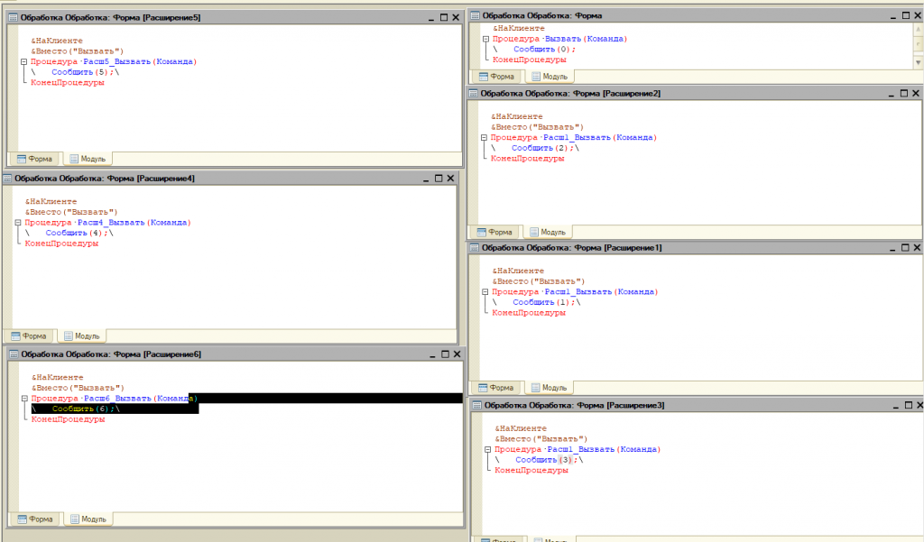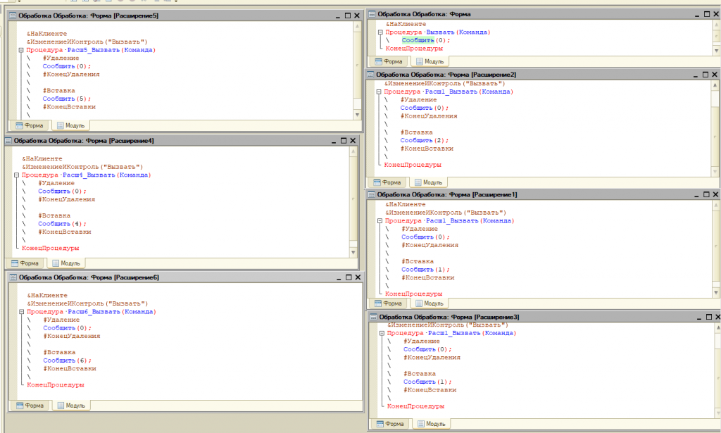 Сделаем во всех расширениях Изменение и контроль с Сообщить, но с числом из расширения и при этом расширения, которые с четвертого номера, делаем с другим наименование Процедуры.