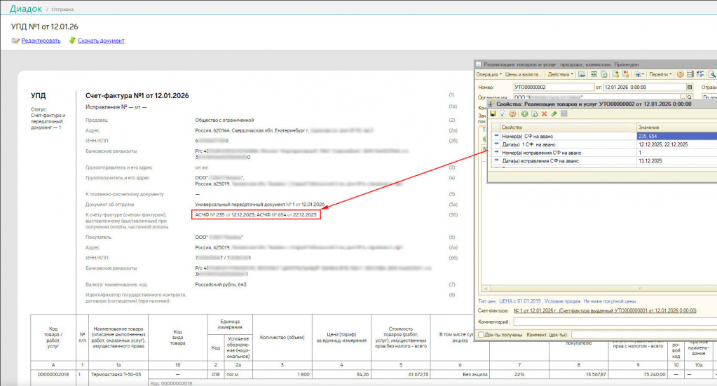 Для иных ситуаций (например авансовые счет-фактуры в базе УТ совсем не создаются) остается ручной ввод данных номеров, дат "Счетов-фактур" на аванс и данных исправлений "Счетов-фактур". При этом может быть так же ситуация, что может оказаться несколько документов аванса. В таком случае пользователь может через "," указать последовательно номера отдельно, даты отдельно (формат ввода даты дд.мм.гггг). Обработка при печати группирует в соответствующие пары и правильным образом выведет в печатную форму: