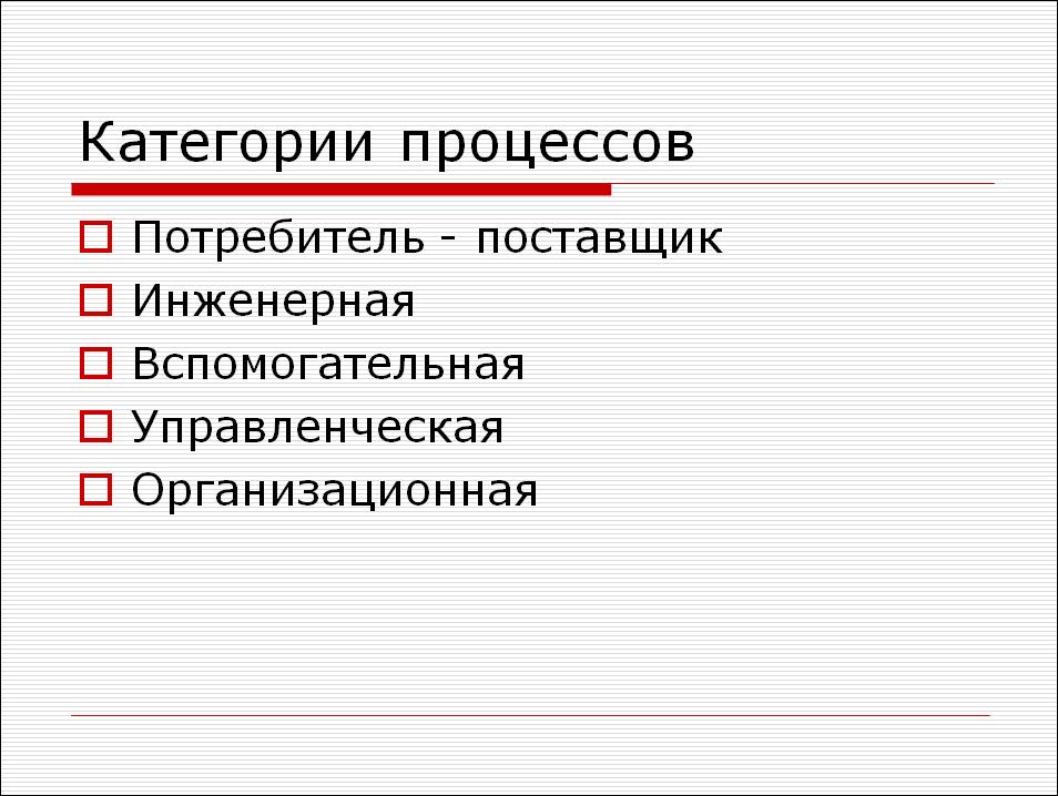 Есть три большие группы процессов, пять категорий и у каждого процесса есть несколько степеней зрелости: Уровни зрелости процессов:
