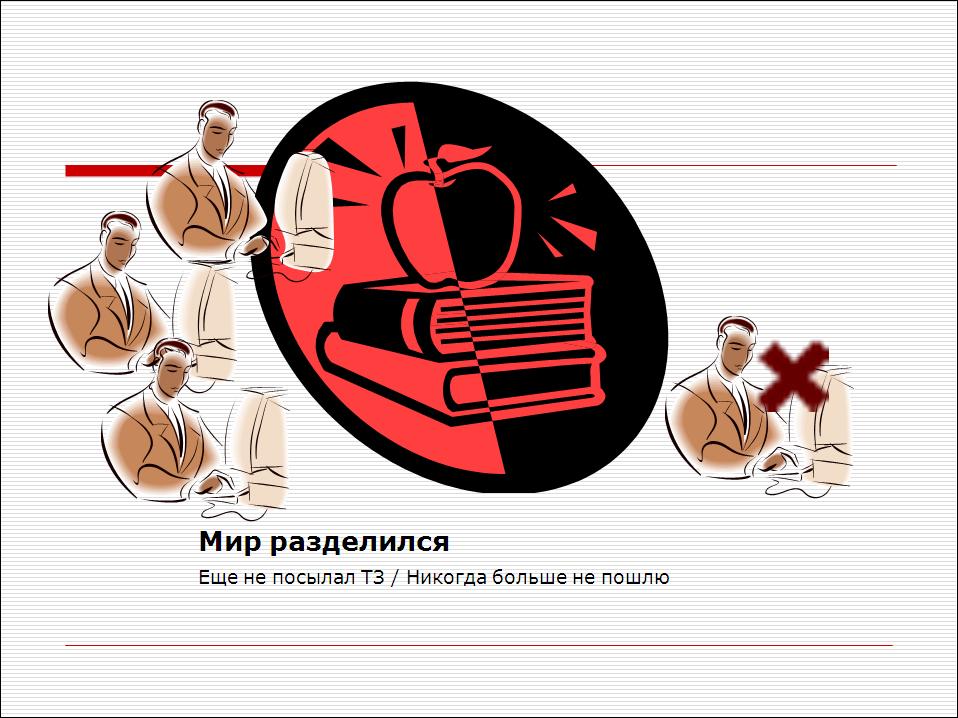 Например, те, кто разрабатывают техническое задание мотивированы от того, чтобы поставить подпись под проектным документом. И ради подписи в техническом задании приходится идти на различные уступки, которые могут привести к краху всего проекта.