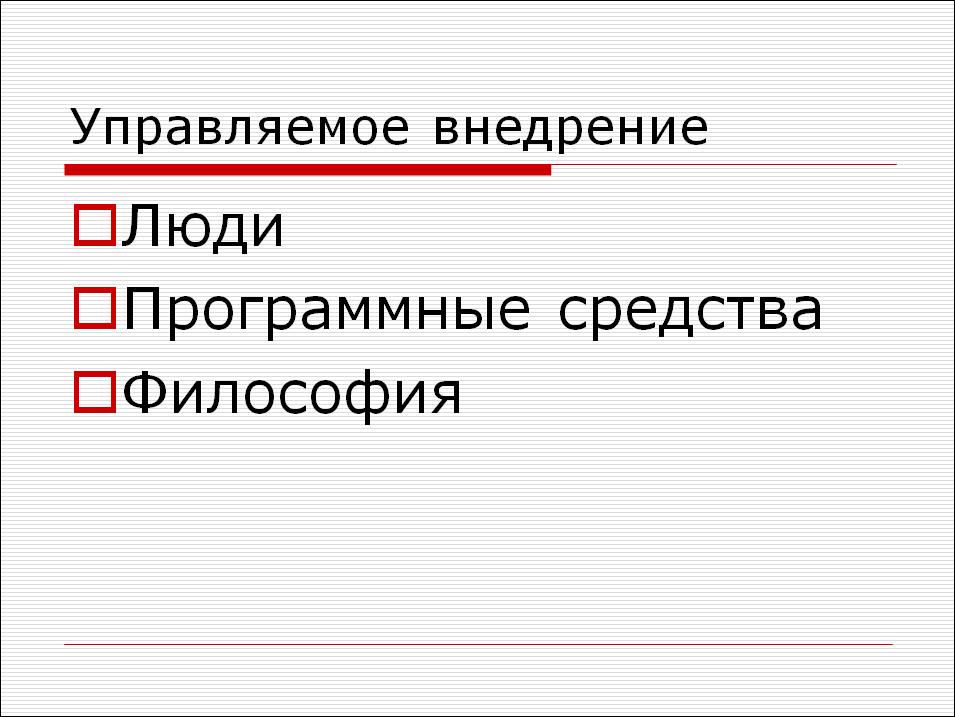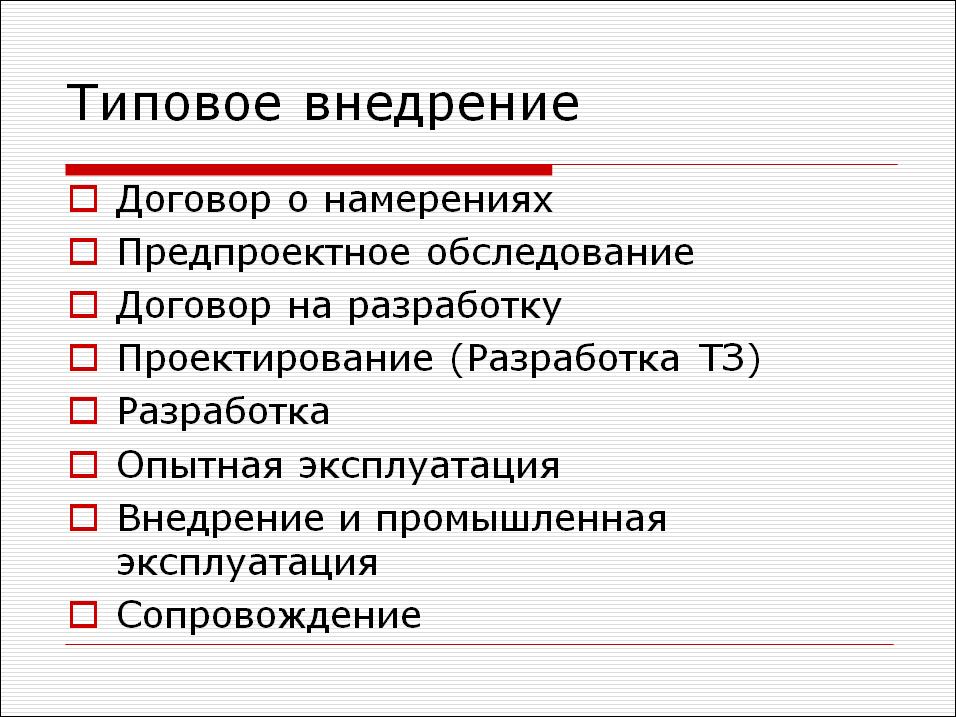 В типовом внедрении, которое было использовано мною в 2002, я практически действовал по технологии PMBoK (классическая схема с разработкой проектного задания). Поскольку этот проект был провальным, от использования этой технологии в следующих проектах отказался. Хотя, проблема не в том, по какой технологии делаешь, а в том, что у людей разный уровень мотивации.