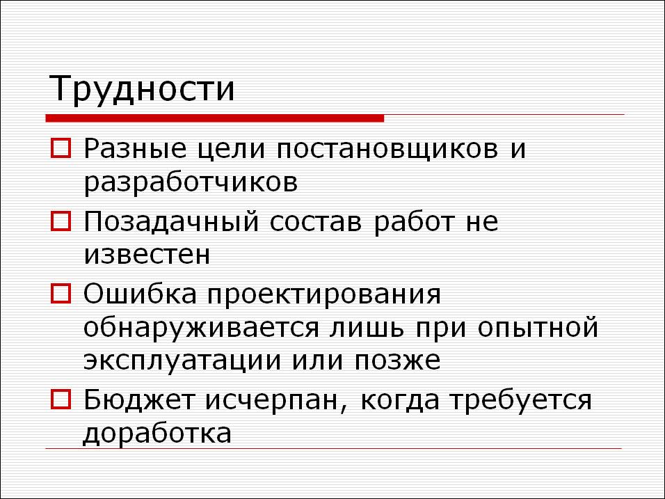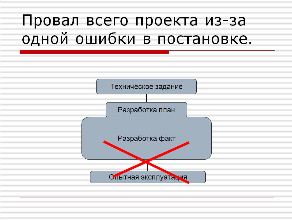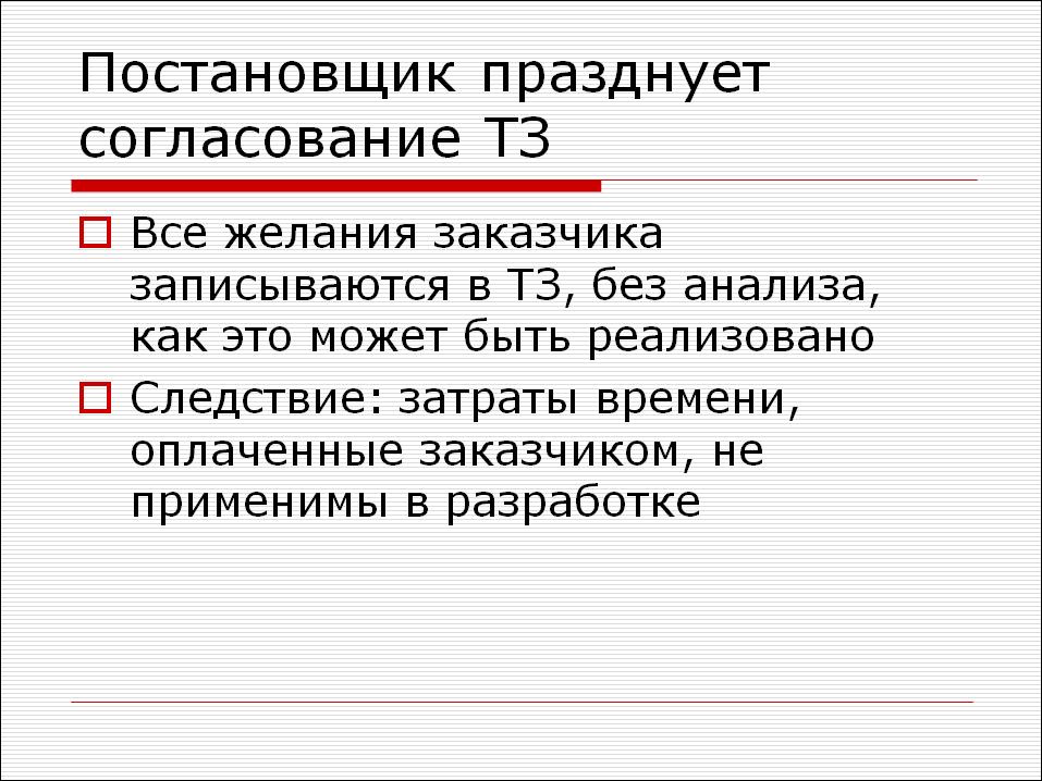 И, соответственно, завершается проект. Исполнитель говорит – я все сделал. Заказчик говорит – а мне еще вот тут не хватает вот этого, вот этого и вот этого. Что-то надо исправлять. Что-то надо дорабатывать. Бюджет уже исчерпан. Исполнителю это уже не интересно. Заказчик получил то, что ему не нужно. Все проиграли. Проект загибается.