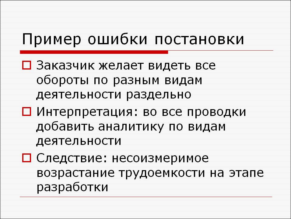 Кроме того, возможные ошибки постановки задачи могут привести к несоизмеримому возрастанию трудоемкости на этапе разработки (неправильный выбор способа решения), приводящие к тому, что бюджет разработки многократно возрастает относительного заложенной изначально величины оплаты этого этапа.