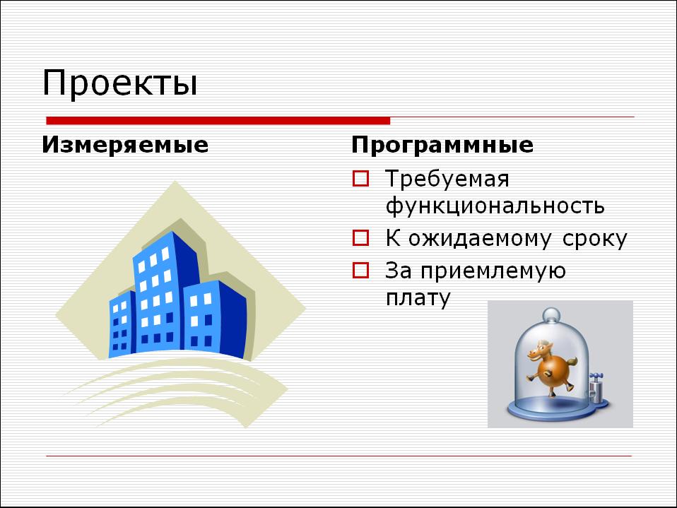 В нашем случае, программные проекты – это такие проекты, в которых отсутствует натуральный измеритель и критерии приемки результата субъективны (вплоть до "нравится/не нравится).