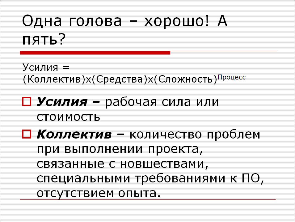 Как только одному разработчику нужно решение руководителя, да еще и согласовать с каким-то из финансовых директоров, то тогда усилия по проекту возрастают в степени - Процесс>=2. (вспомните бюрократию).