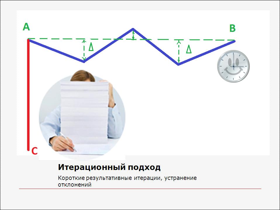 Поэтому я и предлагаю итерационный подход – чтобы при разработке ориентироваться на очень короткие результативные итерации, получающие одобрение и корректировку заказчиком. Тогда проект будет успешным, и наши отклонения от «правильного курса» не скажутся отрицательно на конечном результате.
