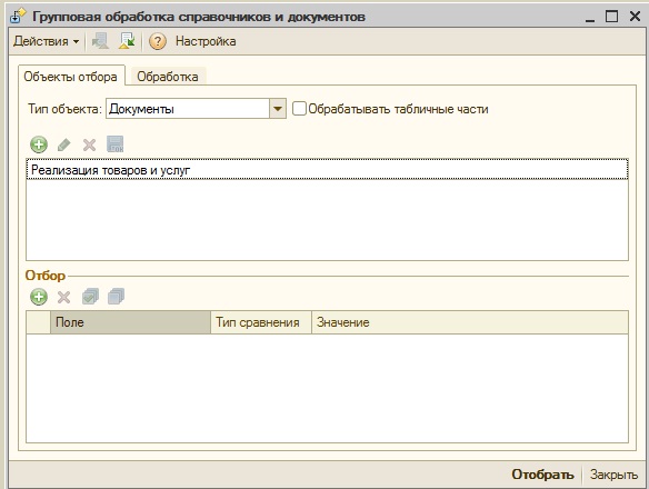 3. На нижней табличной части закладки "Объекты отбора"  задаем требуемые отборы и нажимаем кнопку "Отобрать".