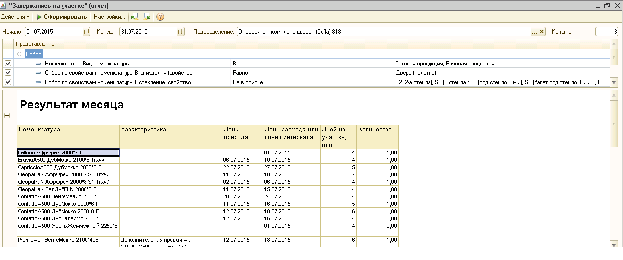 2. Отчет анализирует только период, определенный количеством дней задержки до Даты начала, т.е. если выбран скажем месяц июль (1 июля - 31 июля)  и указано Кол. дней равное 5, то анализируется период с 25 июня. Если продукция поступила на участок раньше начала этого интервала, то поле День прихода остается пустым и отчет показывает, что Дней на участке как минимум 6 дней.