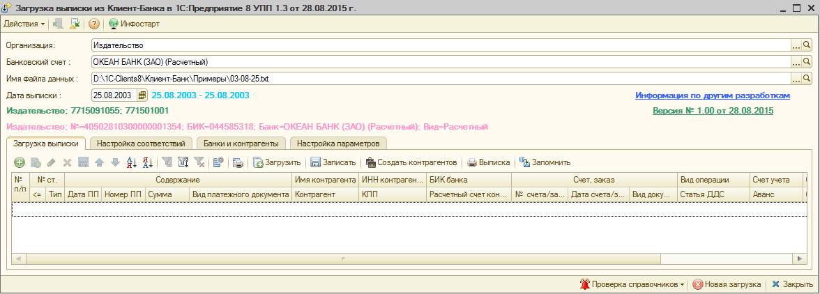 Укажем другую организацию, банковский счет, Имя файла данных и дату выписки. Нажмем кнопку "Загрузить" :