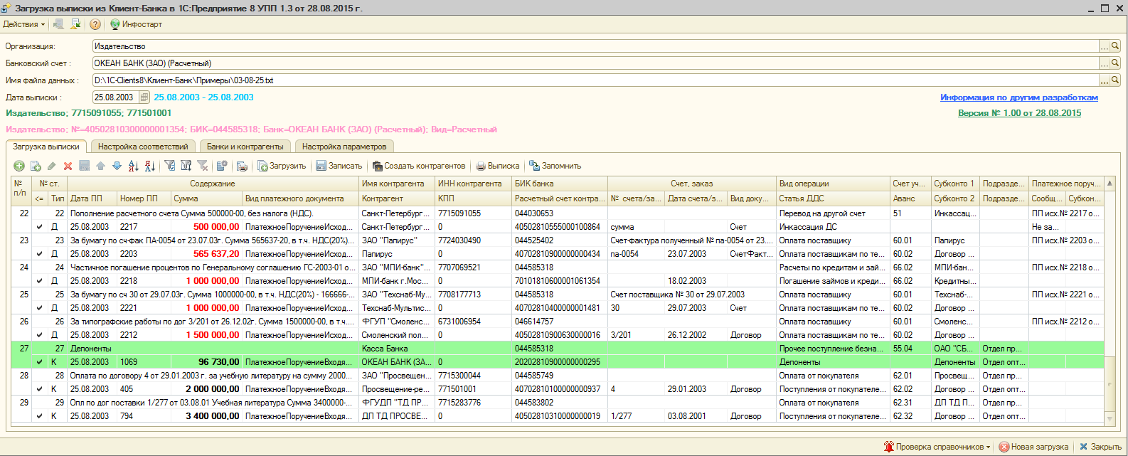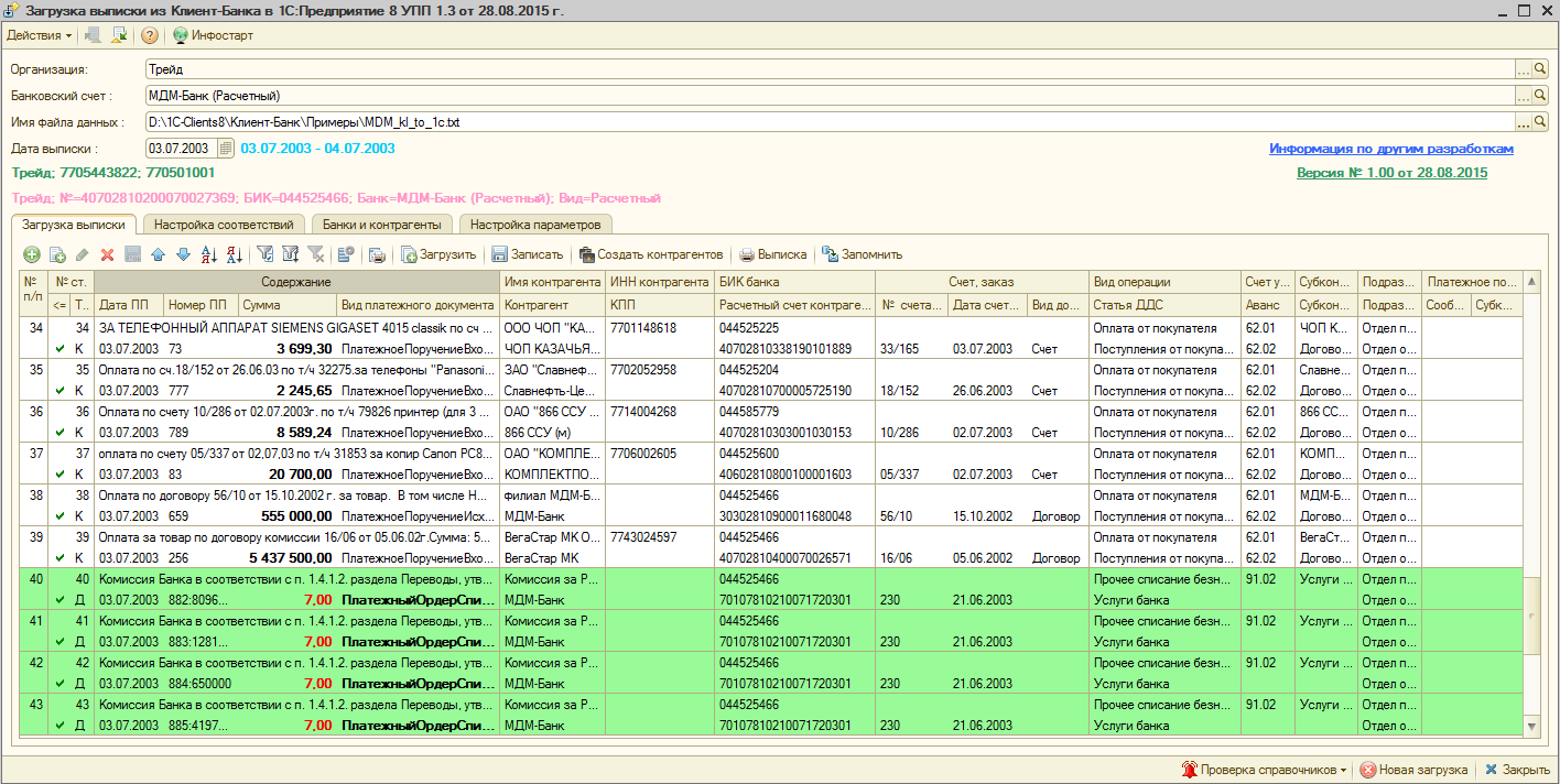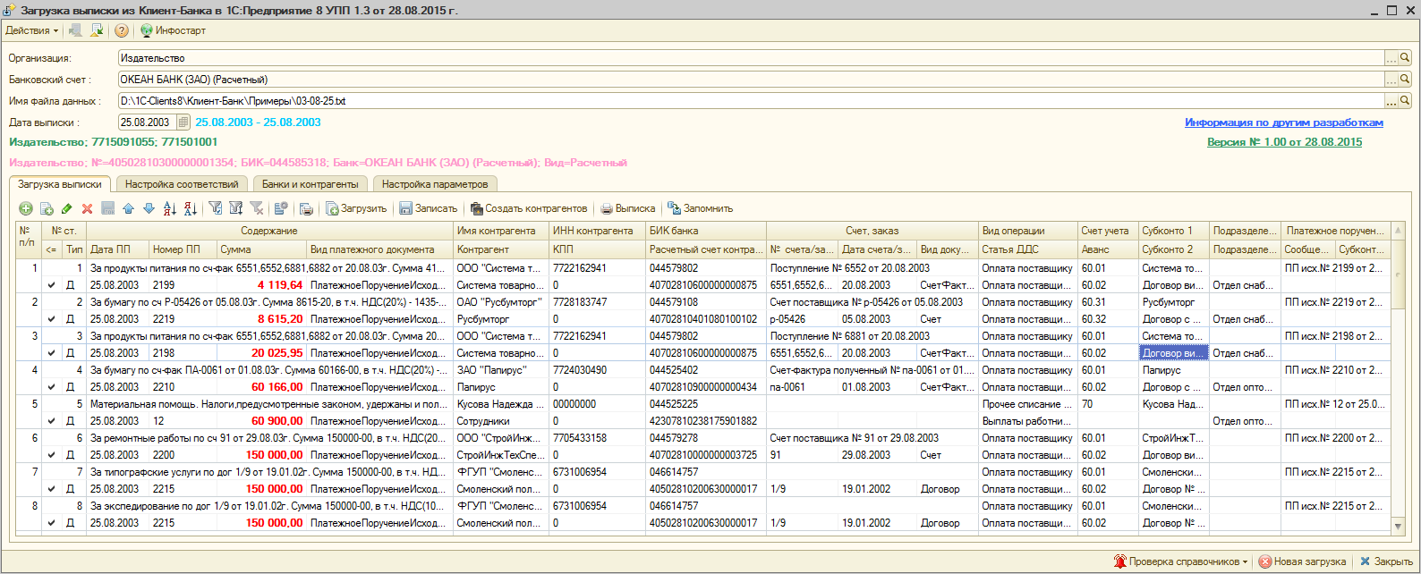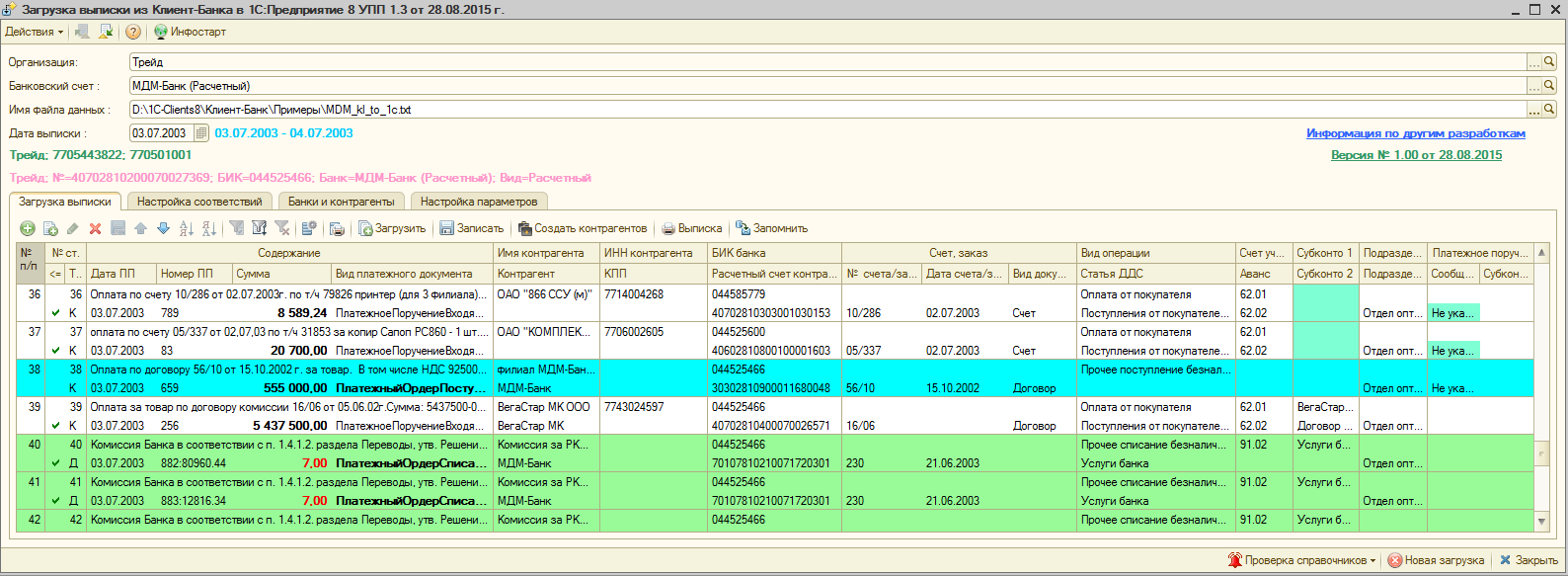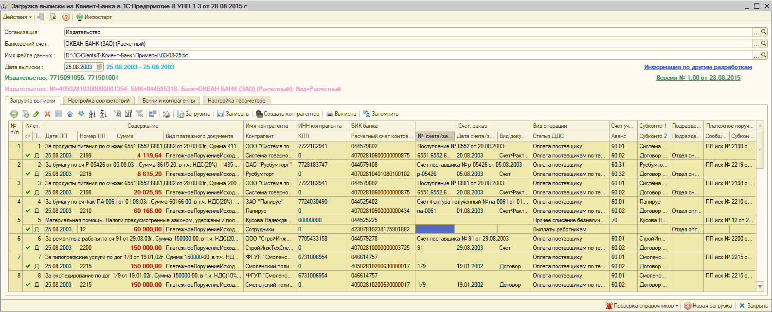 9600 руб. - обработка для загрузки выписки в УПП 1.3 и КА 1.1, а также услуга по настройке соответствий банковских операций и бухгалтерской аналитики, обучение. Требуется удаленное подключение (RDP или Team Viewer)