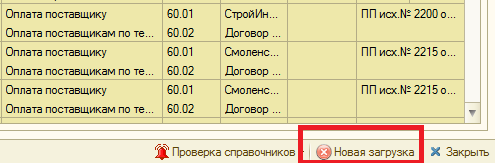 Чтобы изменить организацию, банковский счет, дату выписки, файл выписки, следует нажать кнопку "Новая загрузка" :