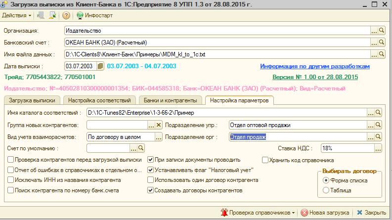 При первом открытии в поле "Организация" попадет Ваша "Организация по умолчанию". В поле "Банковский счет" отобразится реквизит "Основной банковский счет" из выбранной организации. А поле "Имя файла выписки" нужно будет выбрать из каталога, где Вы храните выгрузки из клиент-банка"