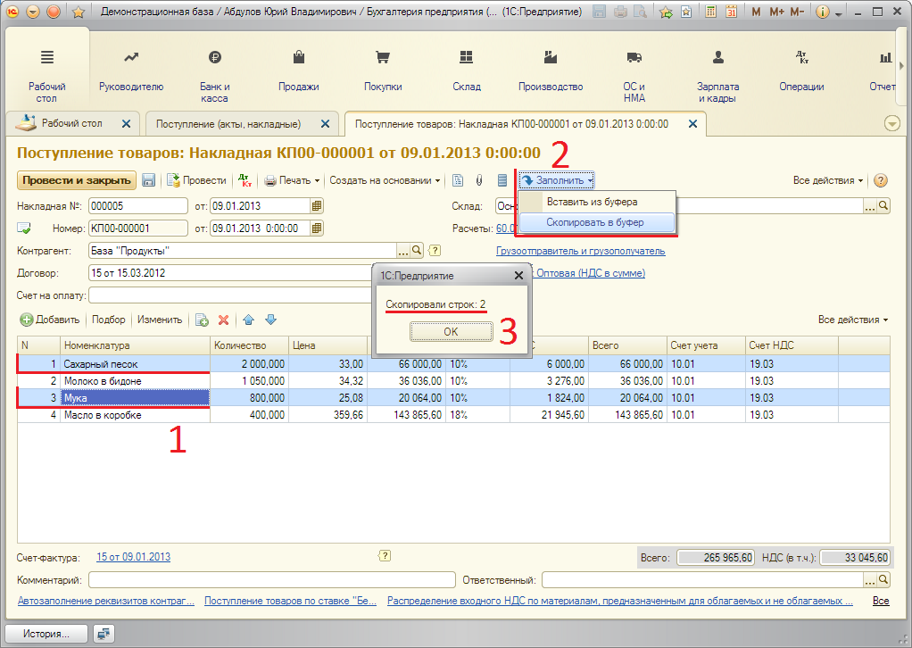 Чтобы скопировать строки ТЧ в буфер обмена, нужно их выделить и вызвать команду "Скопировать":