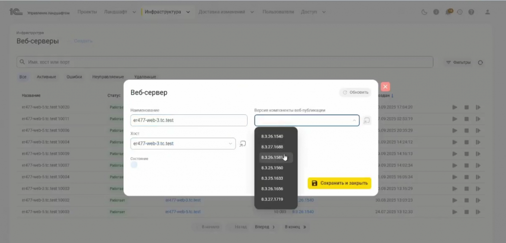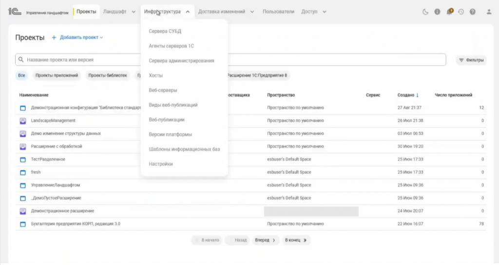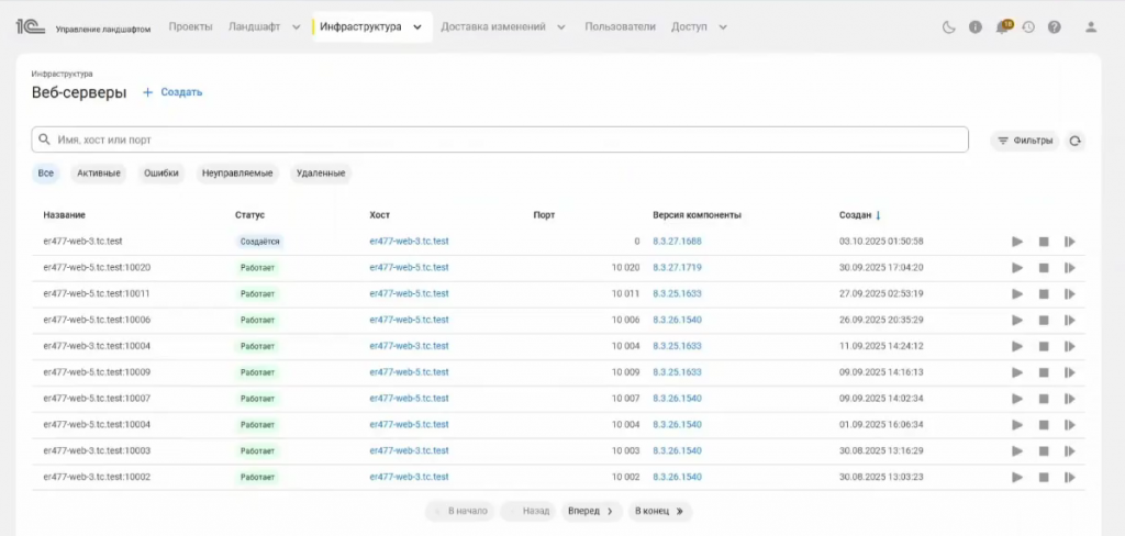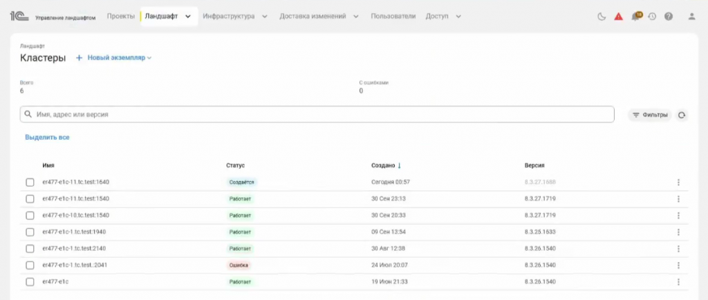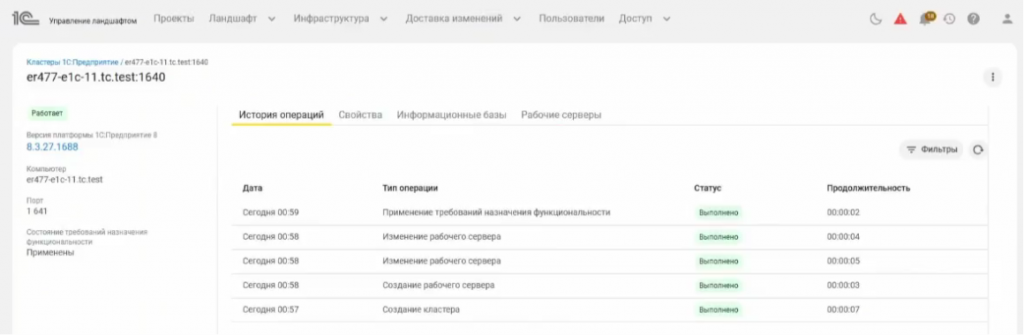 - 1С:Управление ландшафтом построено по принципу единого окна - администрирование, обновления и контроль инфраструктуры выполняются из одной централизованной панели.