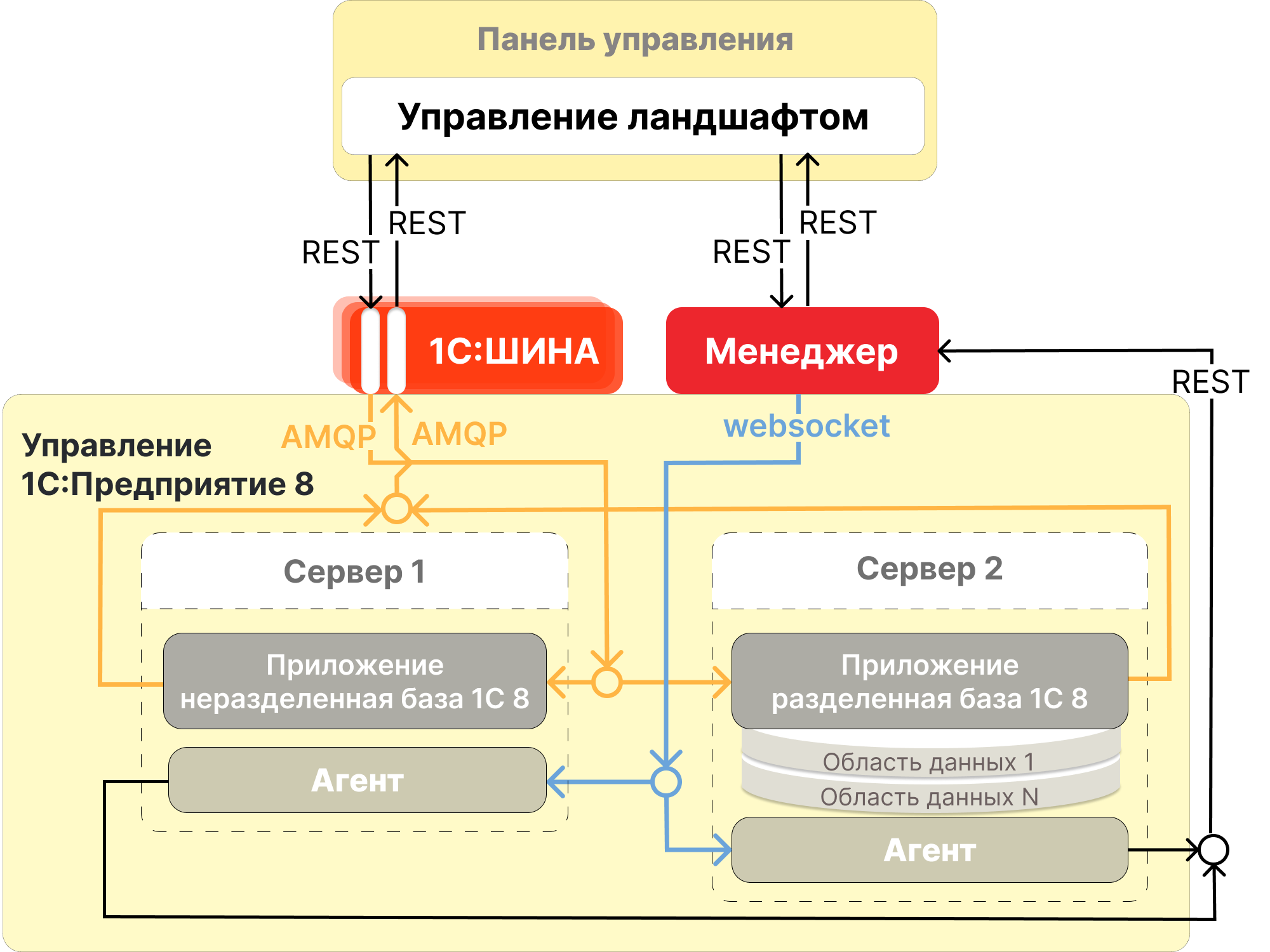 - Взаимодействие компонентов реализовано через REST и WebSocket, а обмен с информационными базами — по AMQP, что обеспечивает надежную и быструю интеграцию всех элементов ландшафта.