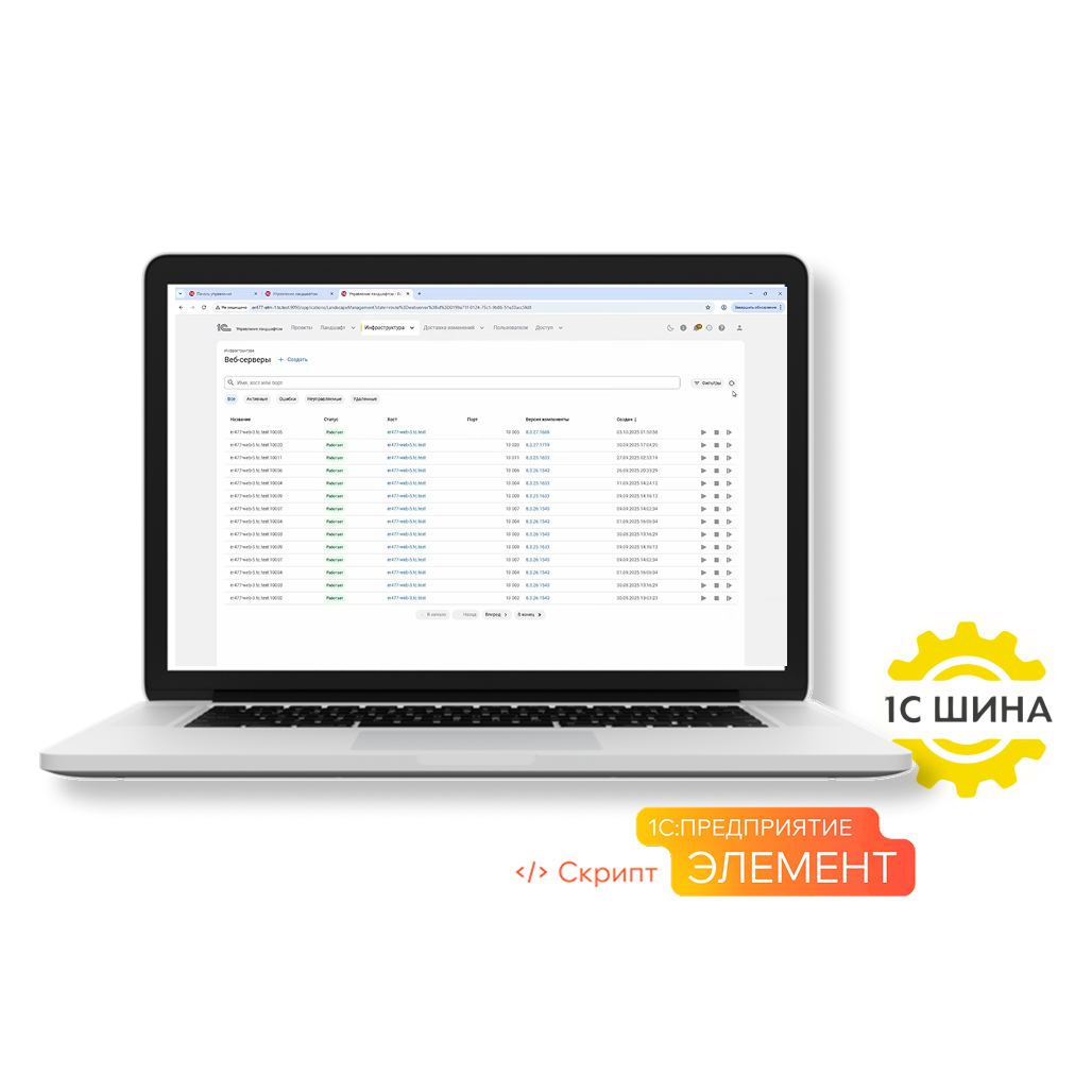 - Система использует 1С:Шину для мгновенной синхронизации между компонентами (пользователи, права, базы, расширения) и 1С:Элемент Скрипт для гибкости и адаптивности.