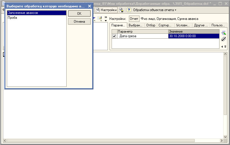 На форме настройки обработок отчета есть поле с деревом отчета в котором мы выбираем для какого отчета мы настраиваем обработки, "доступные поля": это поля доступные для использования в обработке. И панель с закладками: где закладки это и есть обработки и наконец в текстовом поле на закладке сам текст обработки