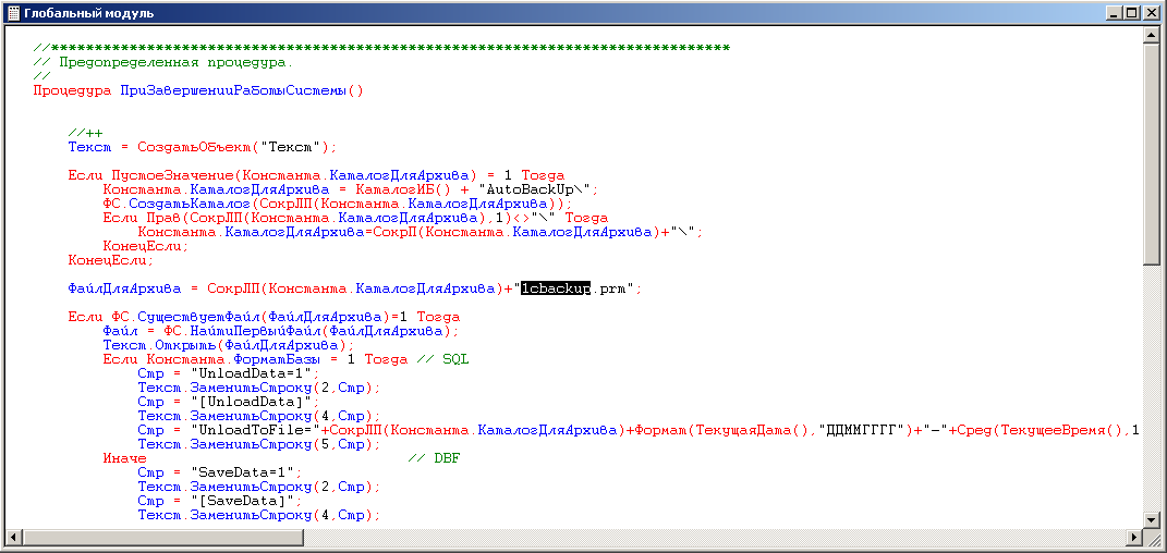 5. Открыть глобальный модуль в информационной базе #1, в процедуре ПриЗавершенииРаботыСистемы() скопировать содержимое и вставить в свою рабочую базу в конец процедуры ПриЗавершенииРаботыСистемы().