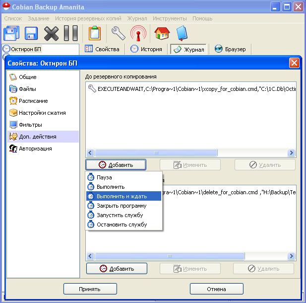 EXECUTEANDWAIT,C:\Progra~1\Cobian~1\xcopy_for_cobian.cmd,"C:\1C.Db\OctironAcc\*.* H:\Backup\Temp1C\OctironAcc\"Дополнительное действие "После резервного копирования" будет выглядеть так: