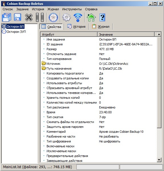 Cobian Backup 9 - бесплатная программа для создания архивов имеет множество настроек (оповещение по e-mail, дублирование файлов архивов, выкладывание архива на FTP и т.д.), для архивирования открытых файлов можно использовать теневое копирование, если это поддерживает система (даже если база 1С занята монопольно все файлы попадут в архив). В данном случае рассматривается вариант настройки программы без использования теневого копирования (например файлы лежат на внешнем USB диске). Файлы перед архивированием копируются в промежуточную папку. Плюсом такого решения является то, что простое копирование выполняется быстрее, чем архивирование и вероятность изменения файлов в процессе архивирования уменьшается. Так же перед архивированием можно удалить из временной папки файлы, которые не требуется архивировать. Очевидный минус такого решения - это то, что если база 1С открыта монопольно, то в архив она не попадет и сообщения об ошибке архивирования не появится, будьте внимательны и осторожны.