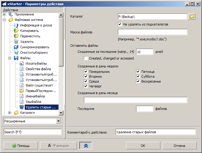 Производится и того проще. Для этого нам достаточно создать задачу на удаление старых файлов "Файлы-Удалить старые файлы". Оставляем созданные например за последние 10 дней, остальное планировщик сделает за нас.