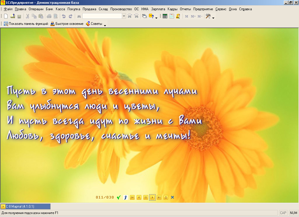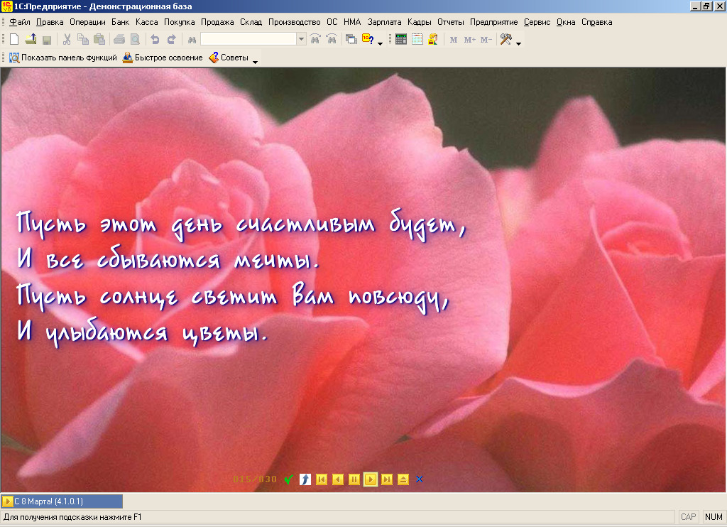 Данная обработка - это универсальный конструктор поздравлений, который позволяет сравнительно легко создать слайд-шоу с графикой высокого качества. Обычно вывести графику высокого качества невозможно стандартными средствами 1С:Предприятия. При растягивании или сжатии картинки качество изображения резко ухудшается. Появляются шум и мусор, меняется цветопередача. Данная обработка обходит этот недостаток 1С:Предприятия предварительно обрабатывая изображение. Для динамической обработки графики под текущее разрешение рабочего стола 1С:Предприятия используется консольный редактор ImageMagick. Также для картинки динамически формируется текст с тенью с прозрачным альфа-каналом. Наложение текста на картинку выполняется динамически с учетом текущего размера рабочего стола 1С:Предприятия.